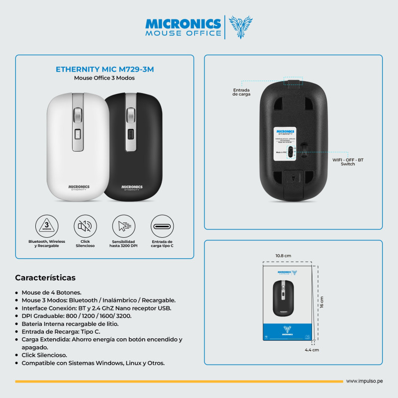 Micronics / Mouse / MIC - Office 3 Modos: Bluetooth + Wireless + Rechargeable