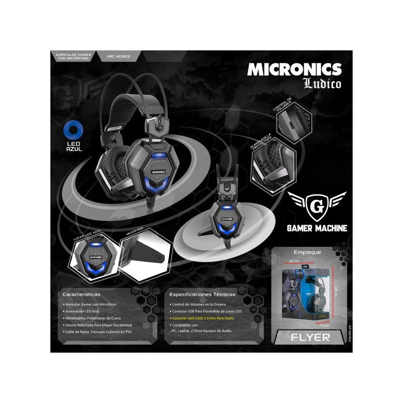 Micronics / Auriculares / MIC - Gamer Machine LED - Conector P4 + P3 - Vibración