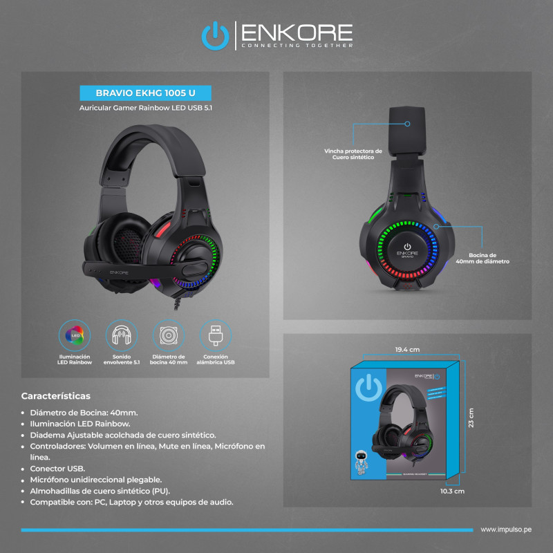 Enkore / Auriculares / ENK - Gamer Rainbow LED - USB 5.1