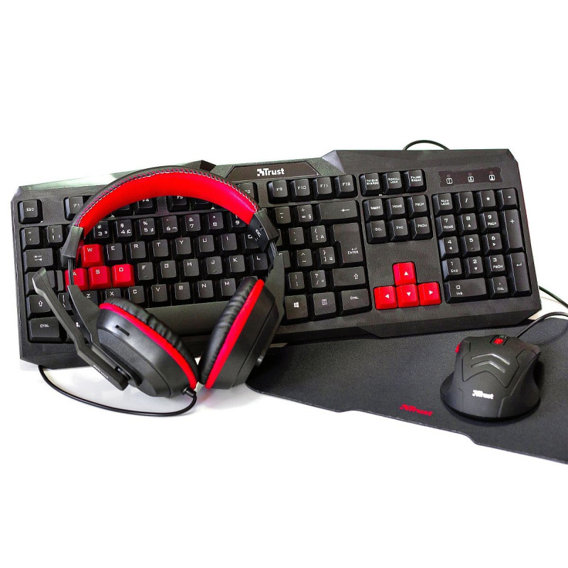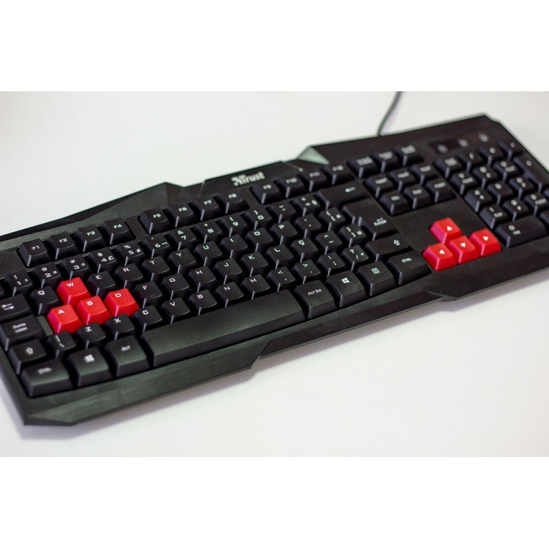 Teclado de tamaño normal con teclas para juegos de color rojo.