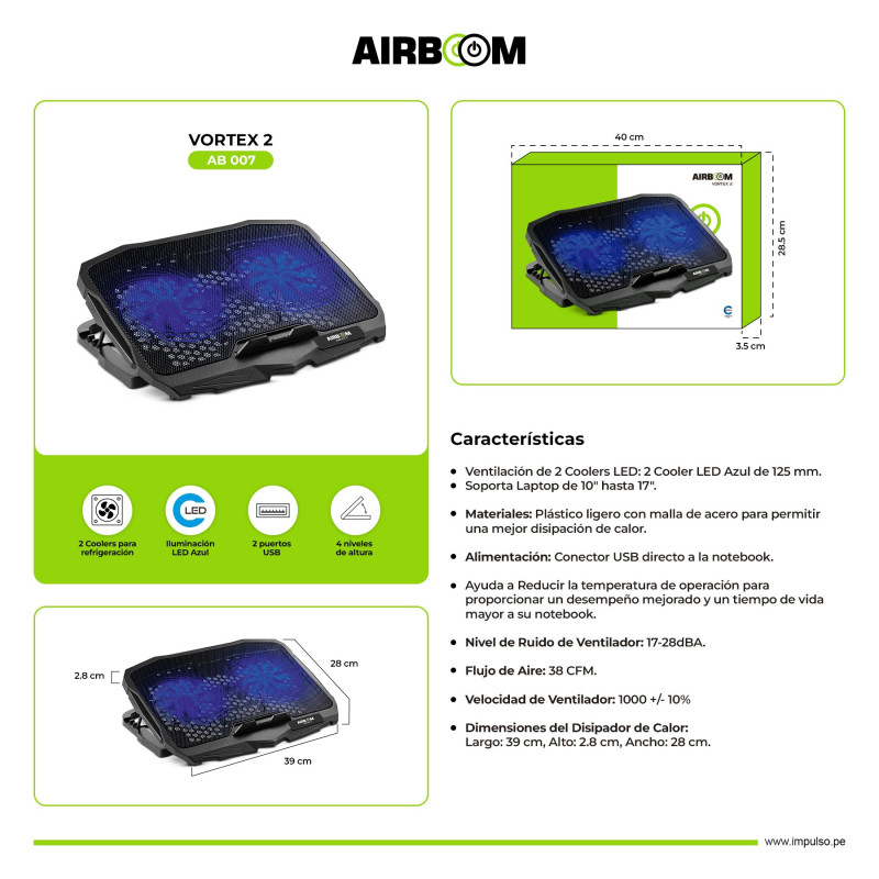 Airboom / Cooler Notebook / Cooler para Notebook 2 Puertos USB - Graduable