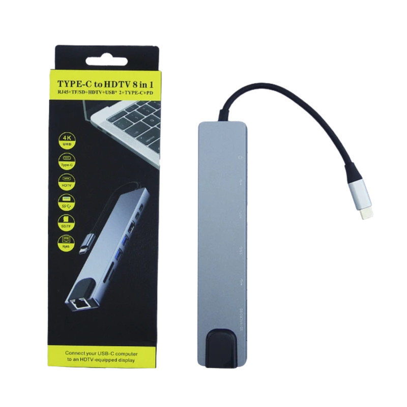 Hub USB Tipo C 8 En 1 combina funcionalidad y diseño con su carcasa de aluminio, ofreciendo LAN, HDMI, 2 x USB, 2 x PD, TF y SD 3.0 para una conectividad expansiva. Ideal para profesionales y entusiastas de la tecnología, mejora tu espacio de trabajo con este dispositivo versátil y de alta calidad.