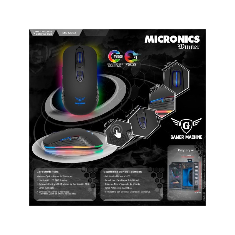 Micronics / Mouse / Gamer Machine 7 Botones RGB Running - Graduables a 3200 DPI con Cable