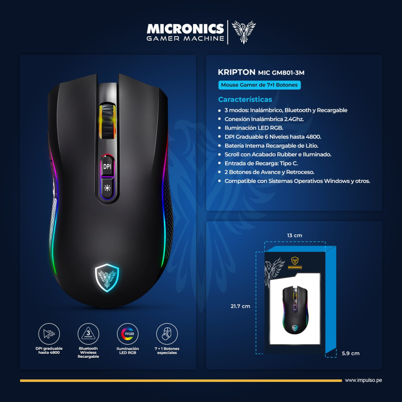 Micronics / Mouse / MIC - Gamer Machine RGB 3M: BT/ WIFI / Recargable