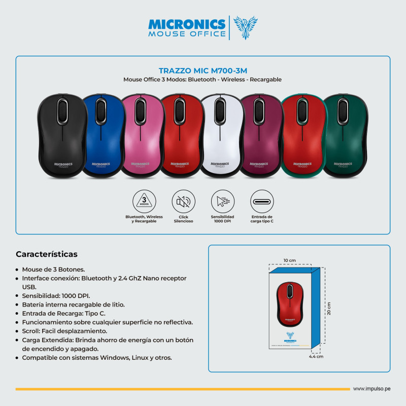 Micronics / Mouse / MIC - Office 3 Modos: Bluetooth / Wireless / Recargable