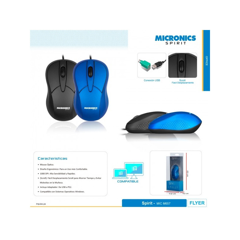MOUSE OPTICO ALAMBRICO MICRONICS SPIRIT MIC M657 CON ADAPTADOR PS2