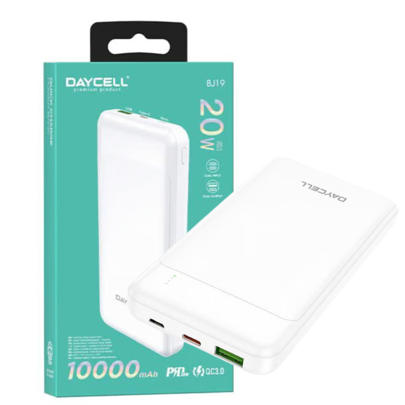 DAYCELL BJ19 power bank 10000mAh, entrada Micro-USB / USB-C 5V / 2A, salida dual USB 5V / 2.1A, pantalla digital LED.